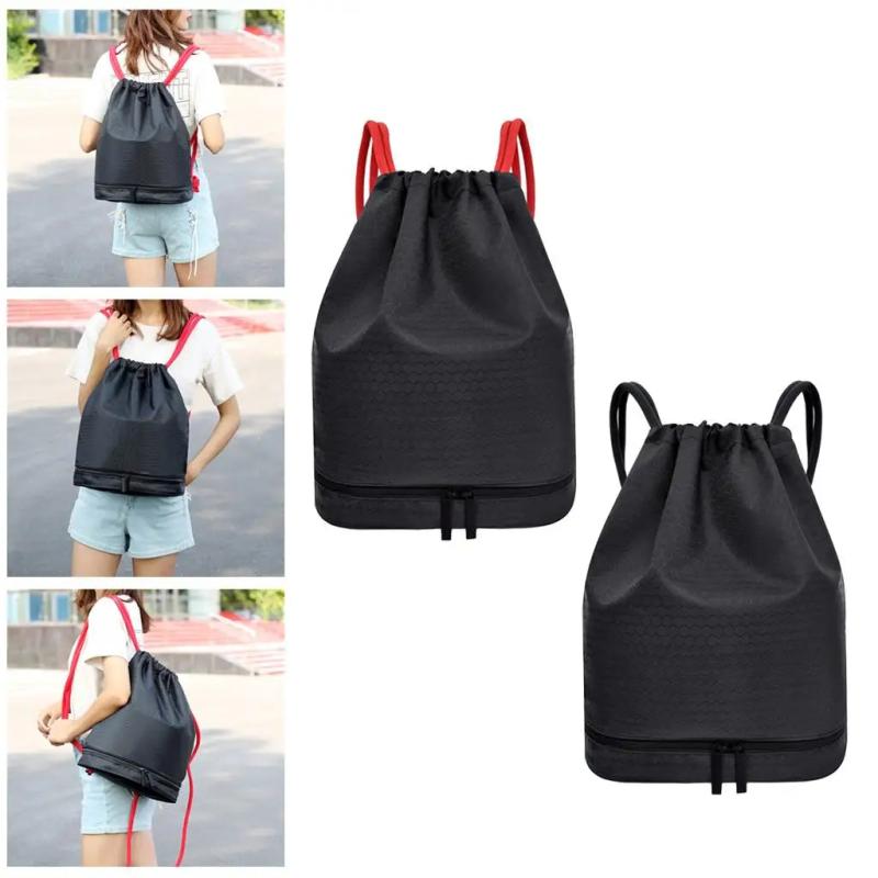 This drawstring backpack is a versatile storage solution made of waterproof polyester, perfect for gym, traveling, and more.