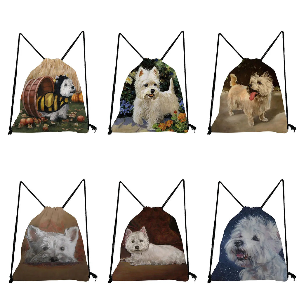 Drawstring Pocket Westie Dog Painting Backpack Students Animal Storage Shoes Bag
