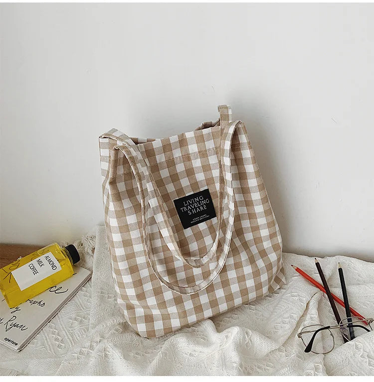 This check plaid canvas bag is made of high-quality flax and cotton linen, ideal for students and women. It's perfect for shopping and everyday use.