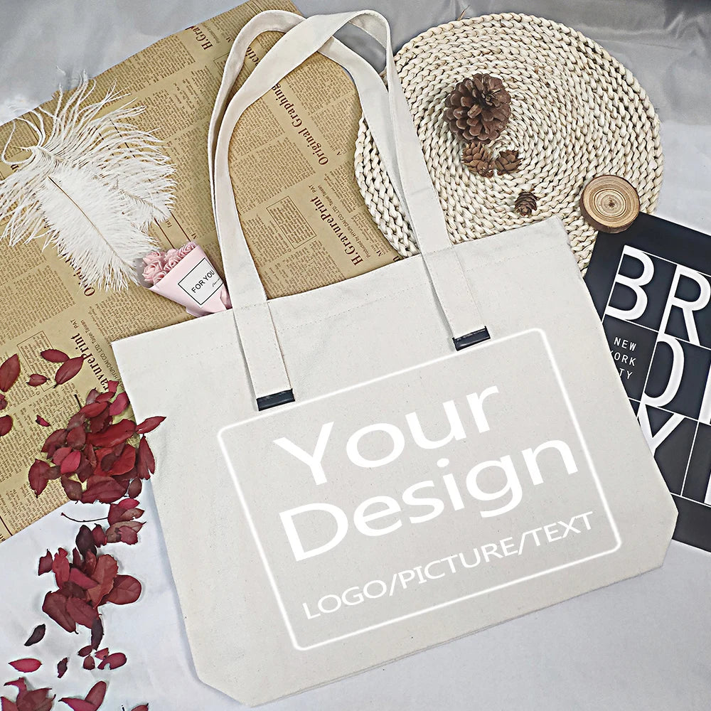 This versatile tote bag is perfect for shopping, travel, and everyday use. It features a stylish print on a beige canvas material and is eco-friendly.