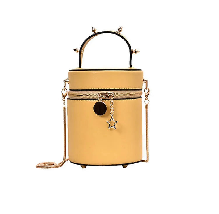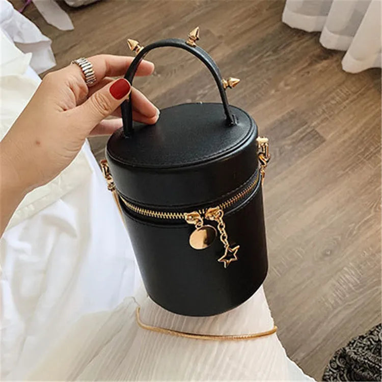 This elegant handbag is designed for the sophisticated lady. It features round rivets, a single shoulder strap, and is perfect for any occasion.