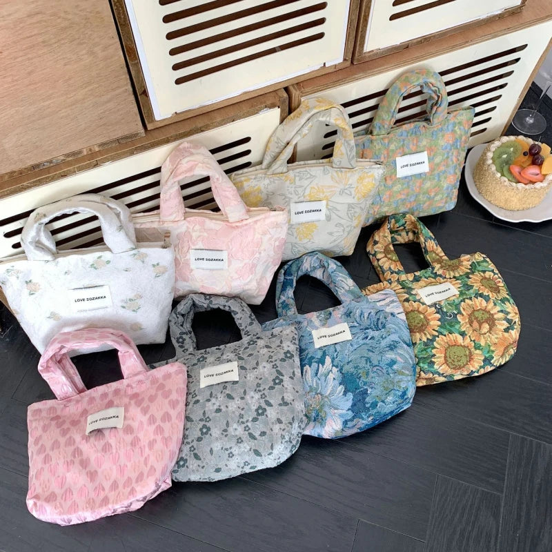 These handbags are made of soft and durable canvas material featuring an embossed flower design. They are perfect for storing your essentials while adding a touch of style to your outfit. The bags come with a zipper closure and are reusable.