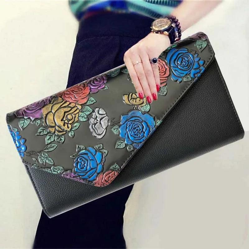 This clutch bag is both stylish and functional, featuring an embossed hand-painted design. It can be worn as a cross-body or carried as a large capacity envelope bag.