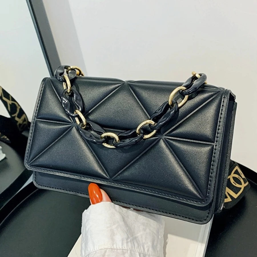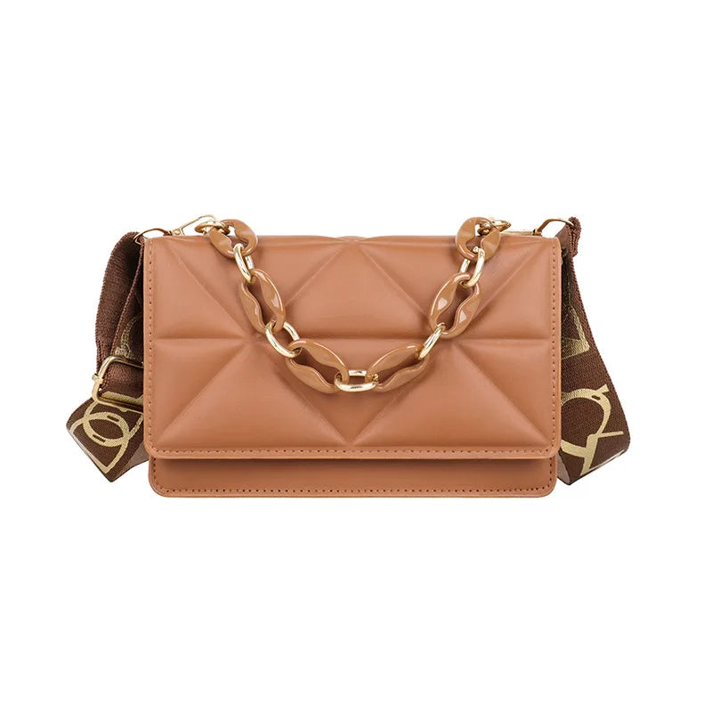 Stay stylish and organized with this small square handbag featuring an embossed leather design. The wide chain shoulder strap adds a trendy touch.