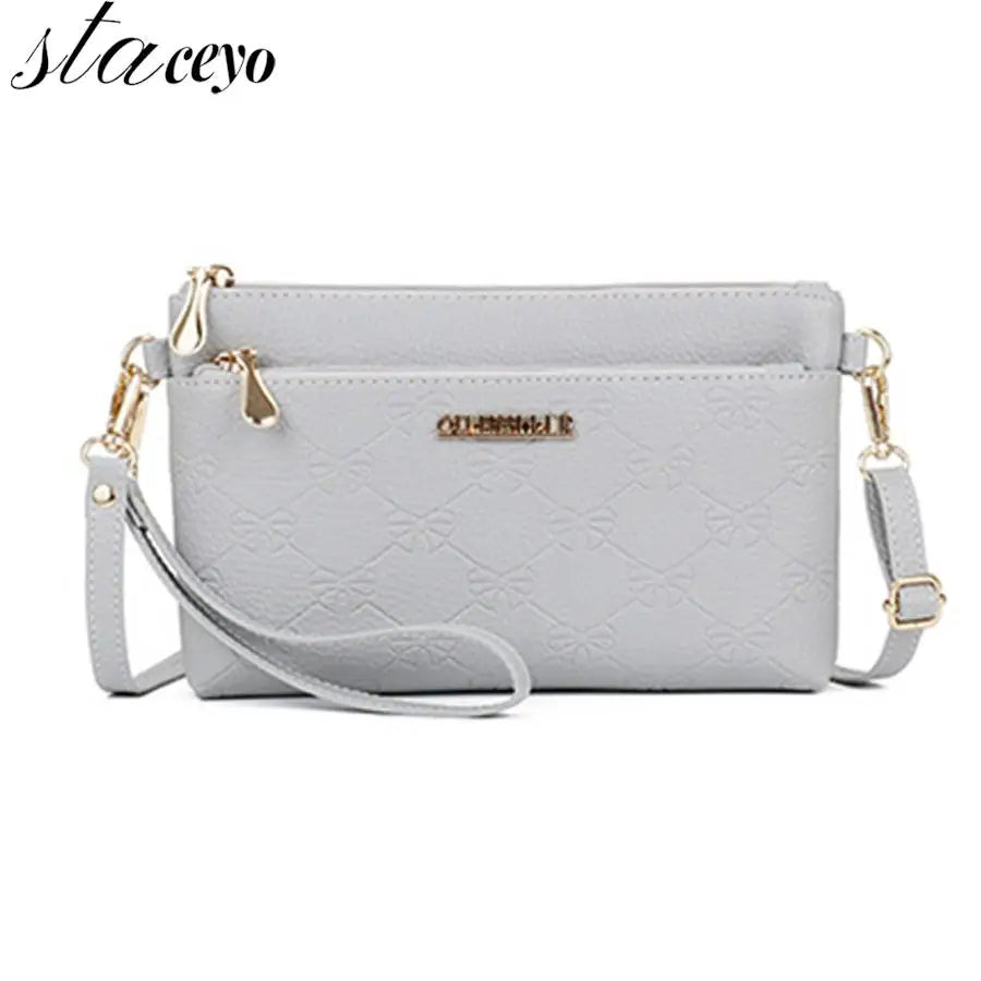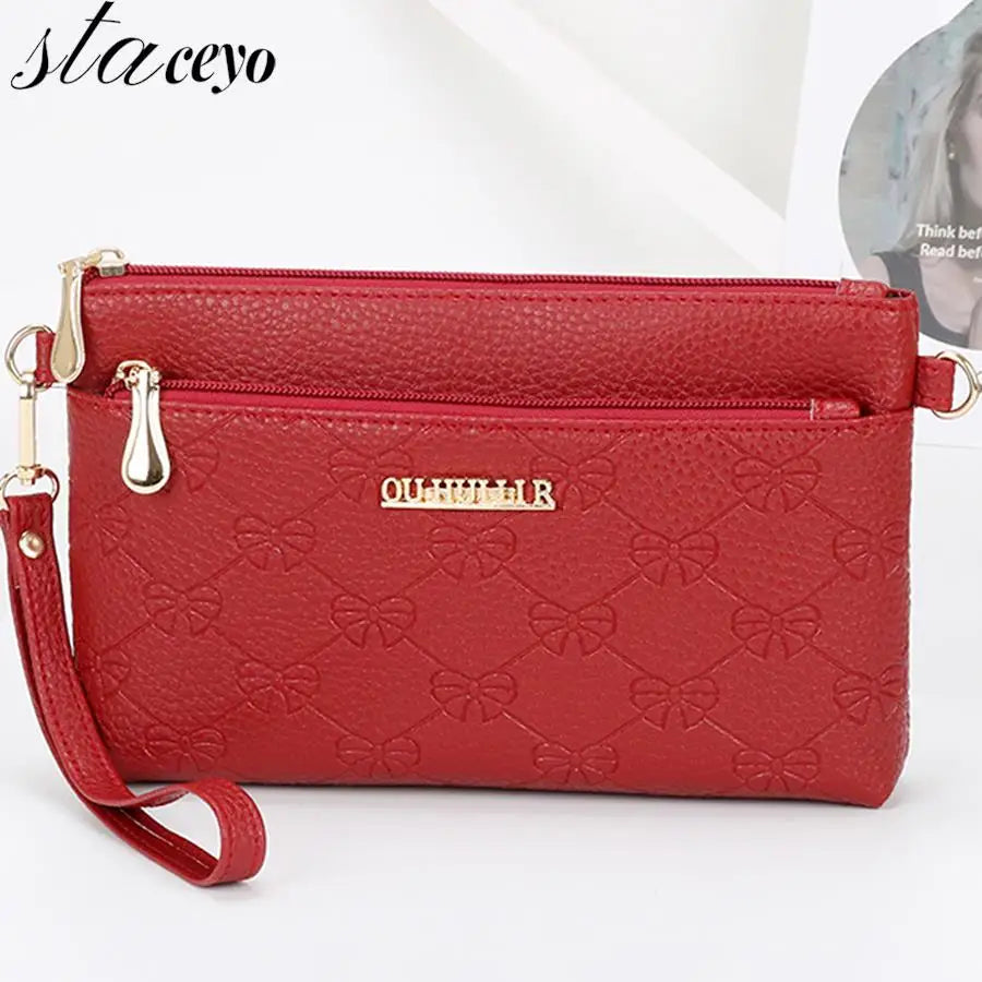 This multi-function shoulder bag is made of high-quality PU leather with embossed design. It features a comfortable wrist strap for easy carrying.