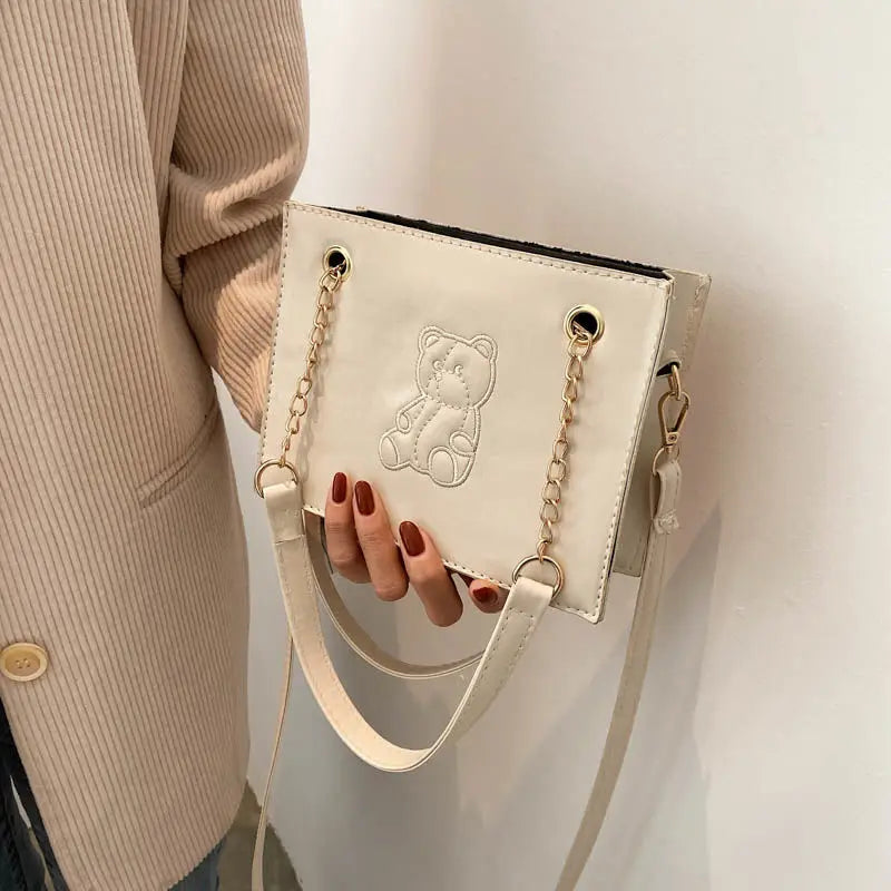 Stay on-trend with this stylish square shoulder bag featuring bear embroidery. Made from high-quality PU leather, this handbag is perfect for everyday use.