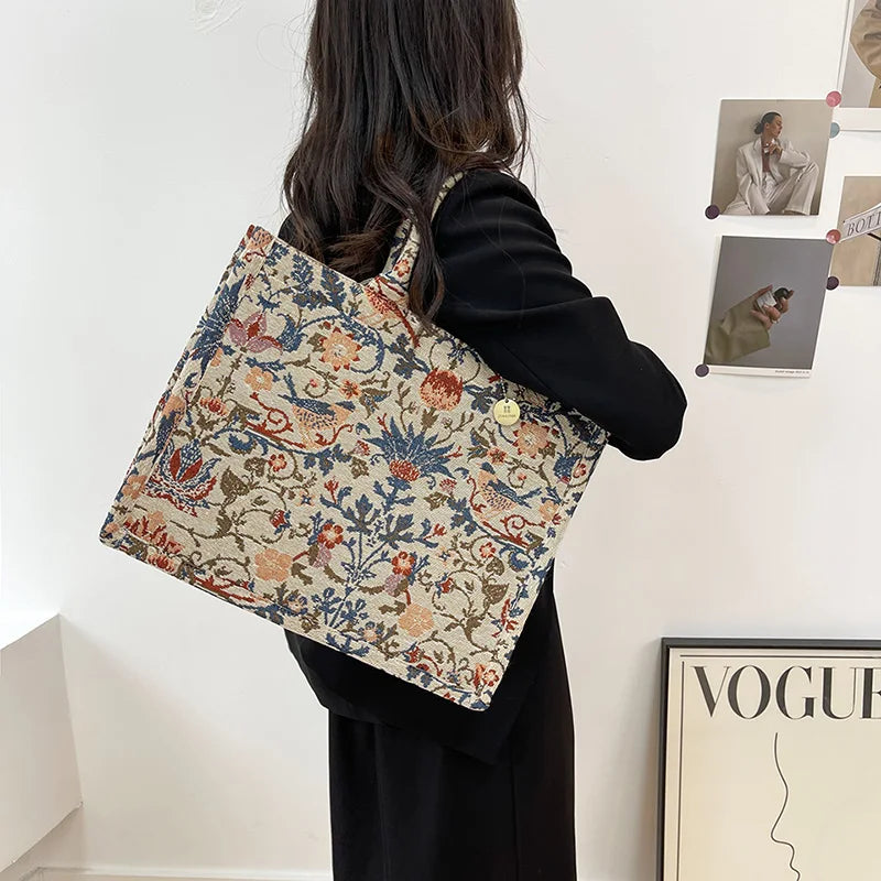 Embroidered Canvas Shoulder Bag Large Tote Handbag