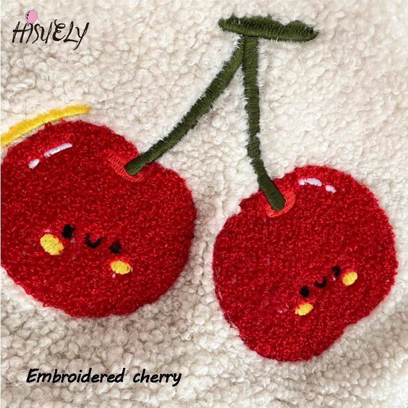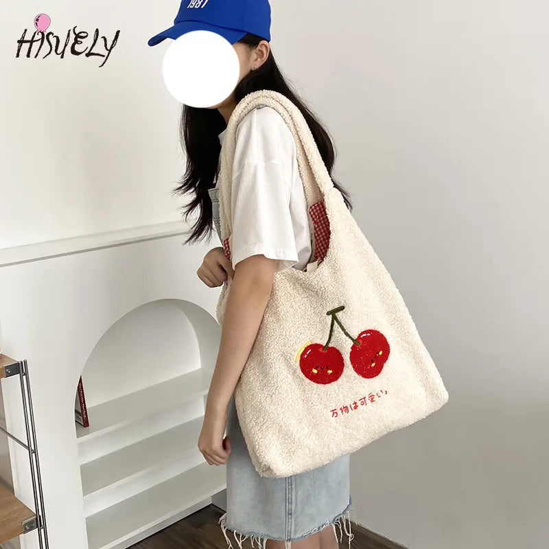 Stay stylish and eco-friendly with this plush tote bag featuring cherry embroidery and a spacious design. Perfect for women and girls on-the-go.