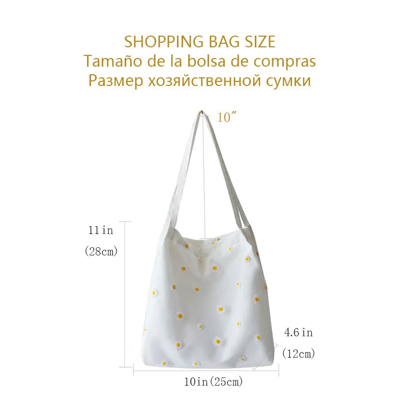 This stylish messenger bag features an elegant daisy embroidery design, perfect for shopping and everyday use. Made from cotton cloth, this eco-friendly shoulder bag is a reusable and practical shopper's choice.
