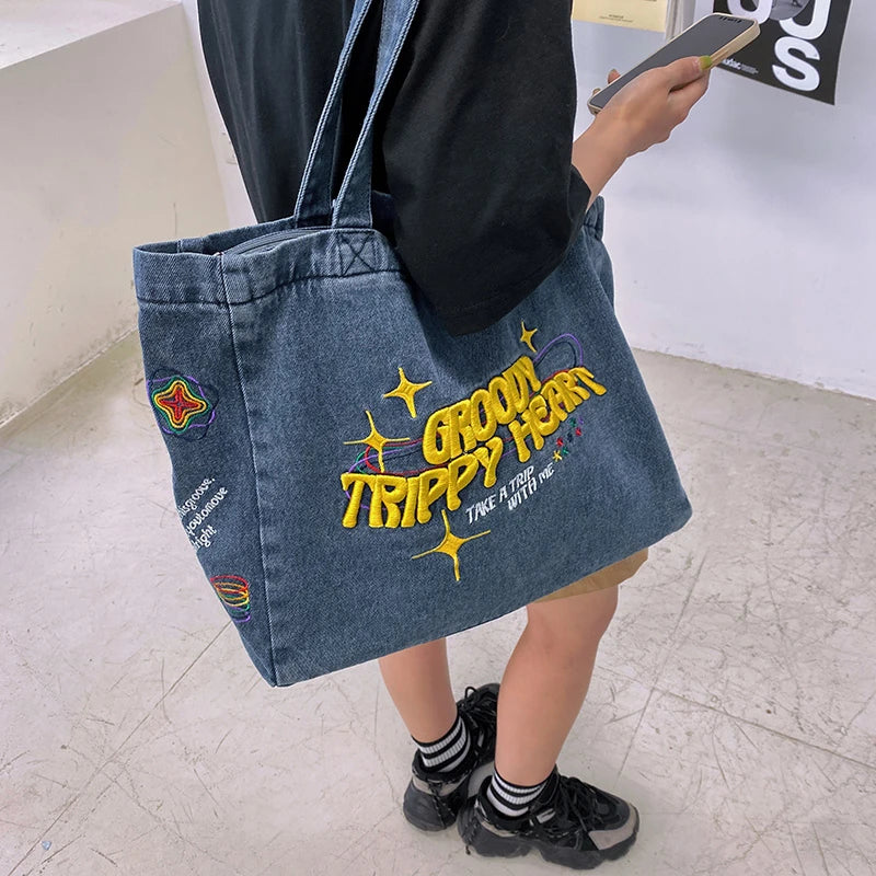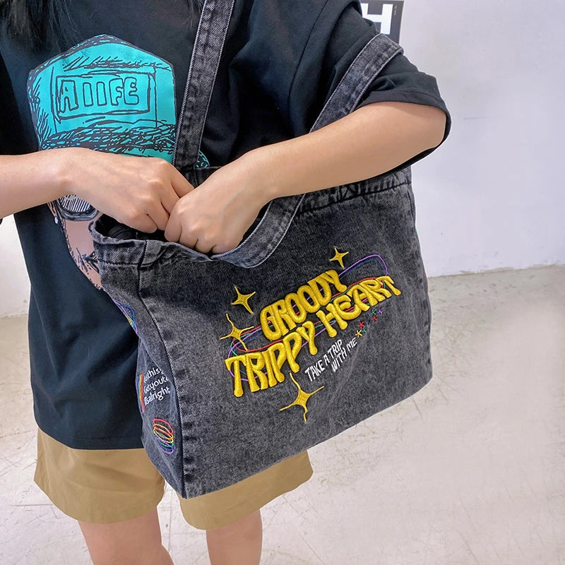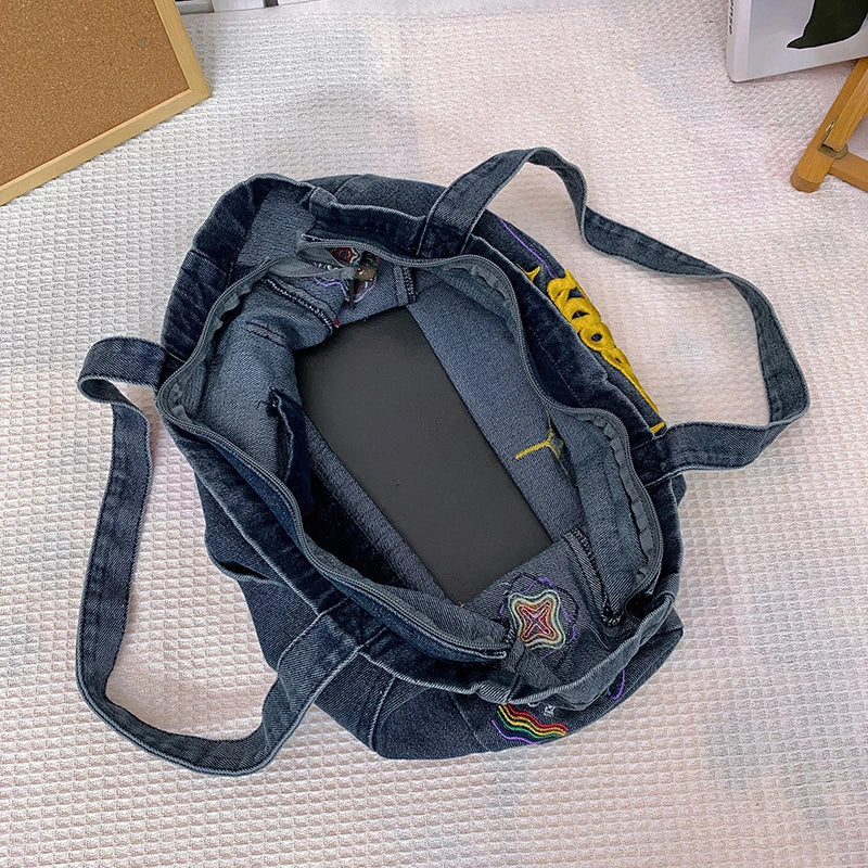 Embroidered Denim Crossbody Bag for Women Casual Shoulder Handbag Tote