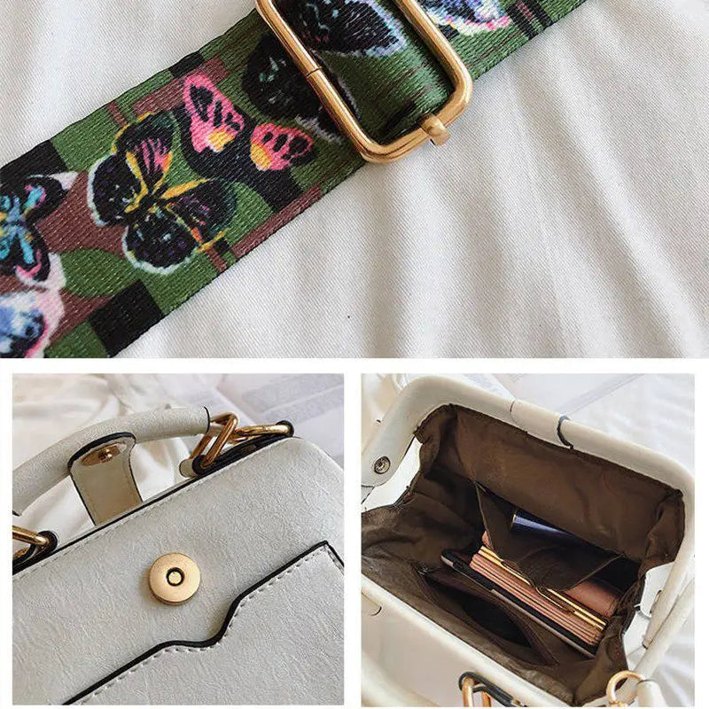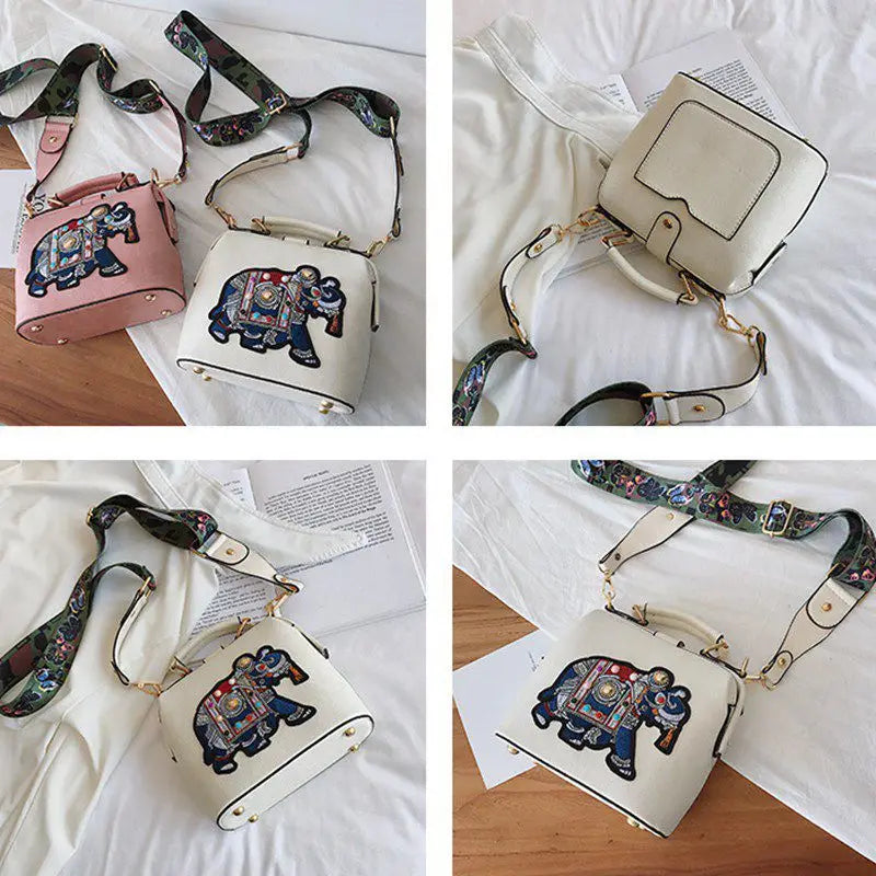 Stay stylish with this vintage-inspired PU leather shoulder bag featuring beautiful embroidery of an elephant. The wide butterfly strap adds a unique touch to your outfit.