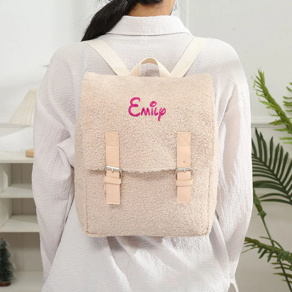 Stay cozy and stylish with this embroidered lamb fleece backpack that is perfect for autumn and winter. Ideal for travel, this rucksack offers convenience and comfort.