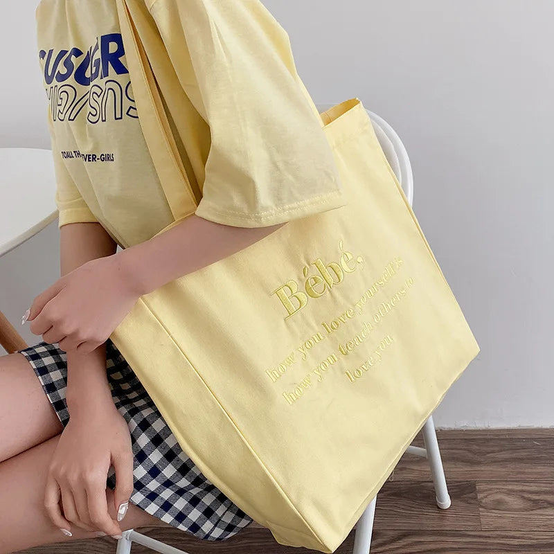 Spacious tote handbag perfect for students and shopping, made of durable canvas with stylish embroidery.