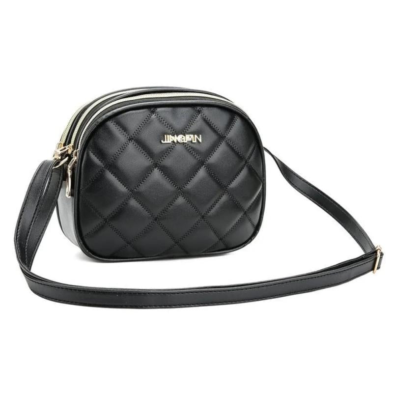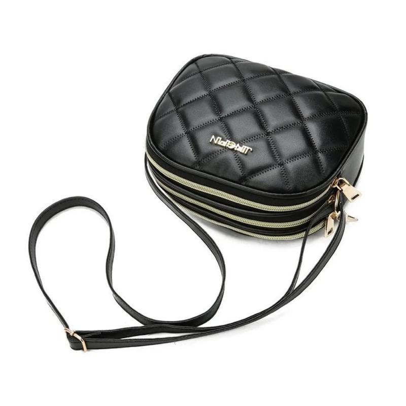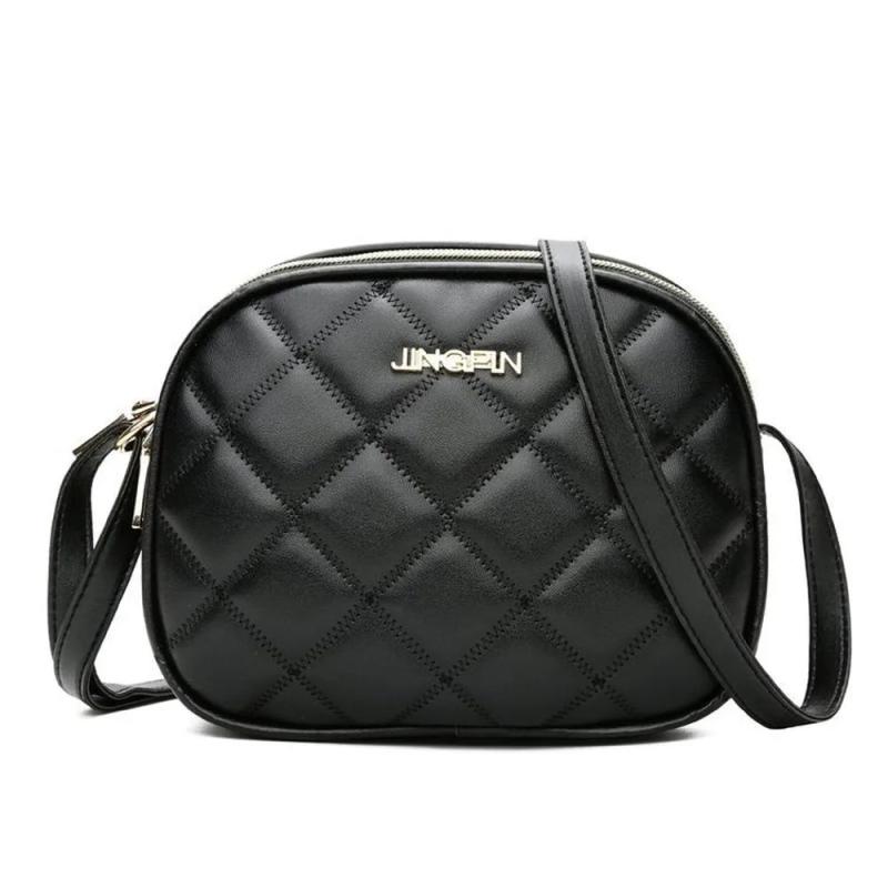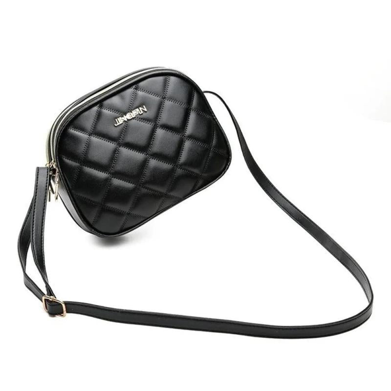 This stylish women's bag features a rhombus pattern with intricate embroidered thread details. It offers a large capacity and can be used as a shoulder messenger bag or a small round handbag purse.