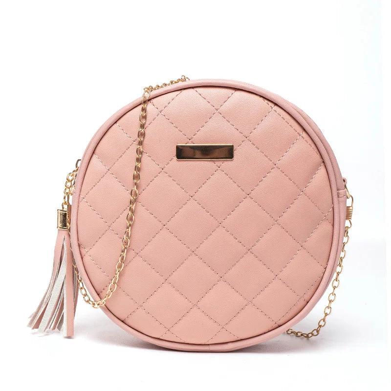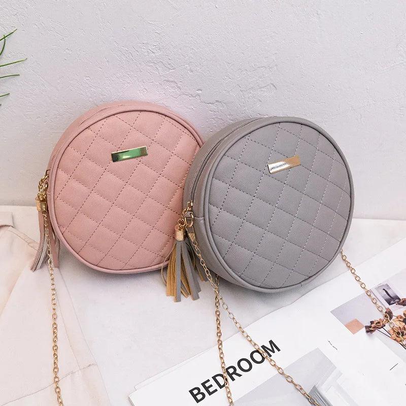This small round bag is a stylish and versatile accessory for women. It features delicate embroidery and is perfect for various occasions.