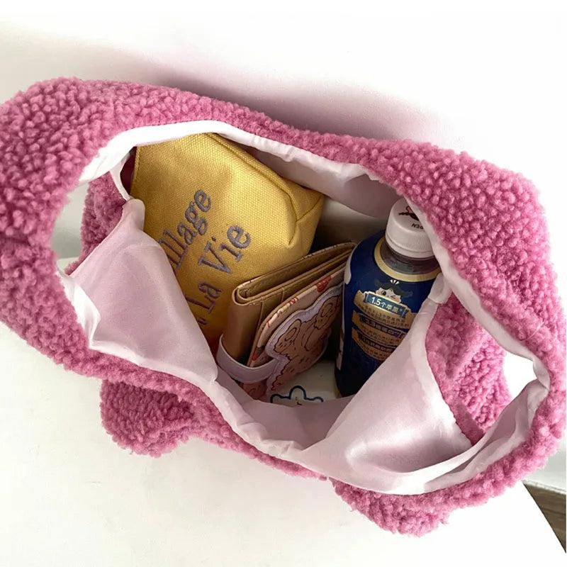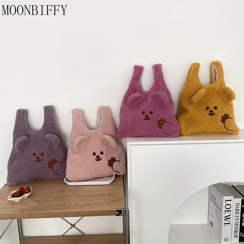 Embroidery Lambs Wool Handbag Plush Shopper Women Tote Bag Winter Bear