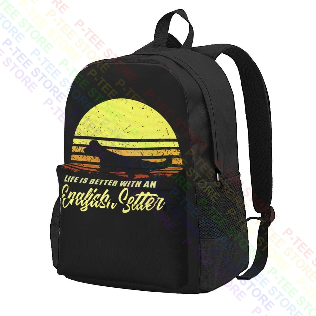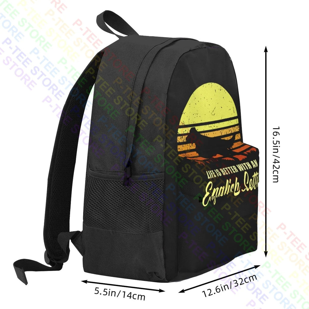 Large capacity backpack featuring a 3D print of an English Setter bird dog lover under the sun.