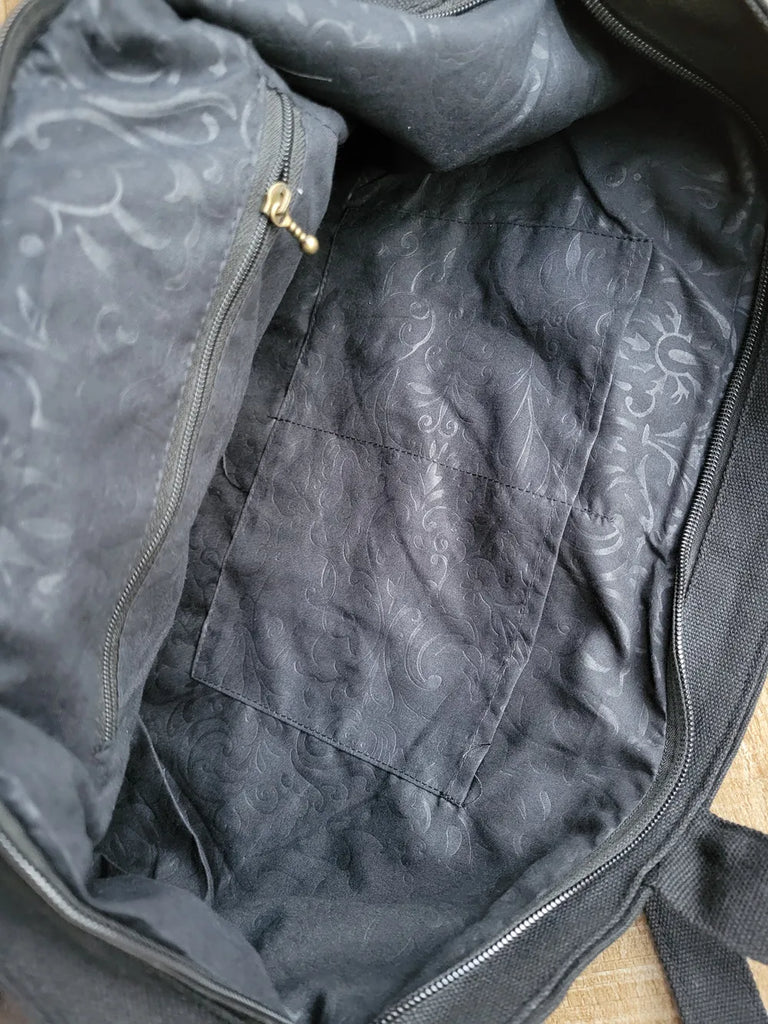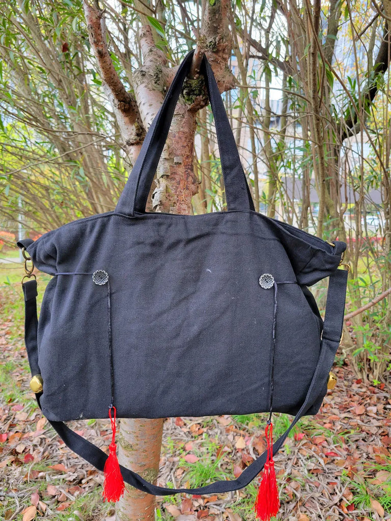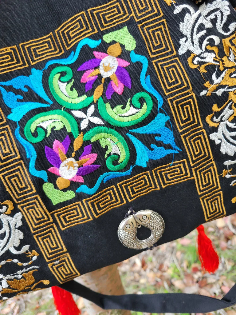 This large size canvas bag features ethnic embroidery and a tassel design. It is perfect for everyday use and adds a unique touch to your outfit.