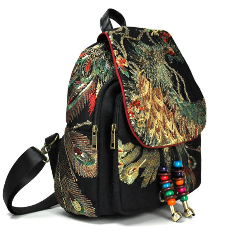 This stylish women's backpack features intricate peacock embroidery and high-quality canvas material. Perfect for schoolgirls and daily use.