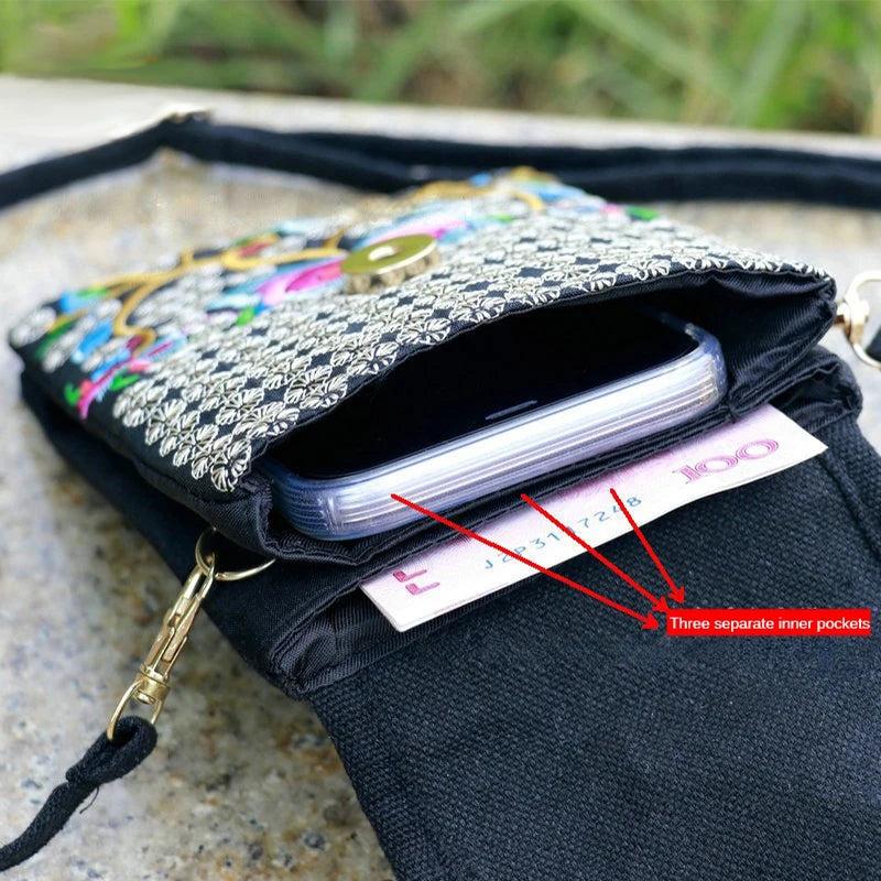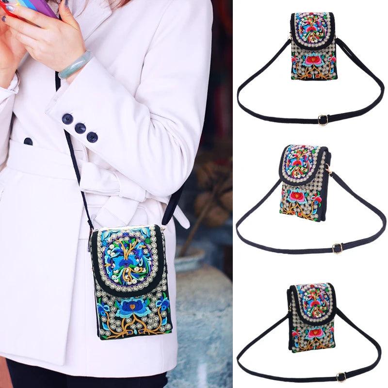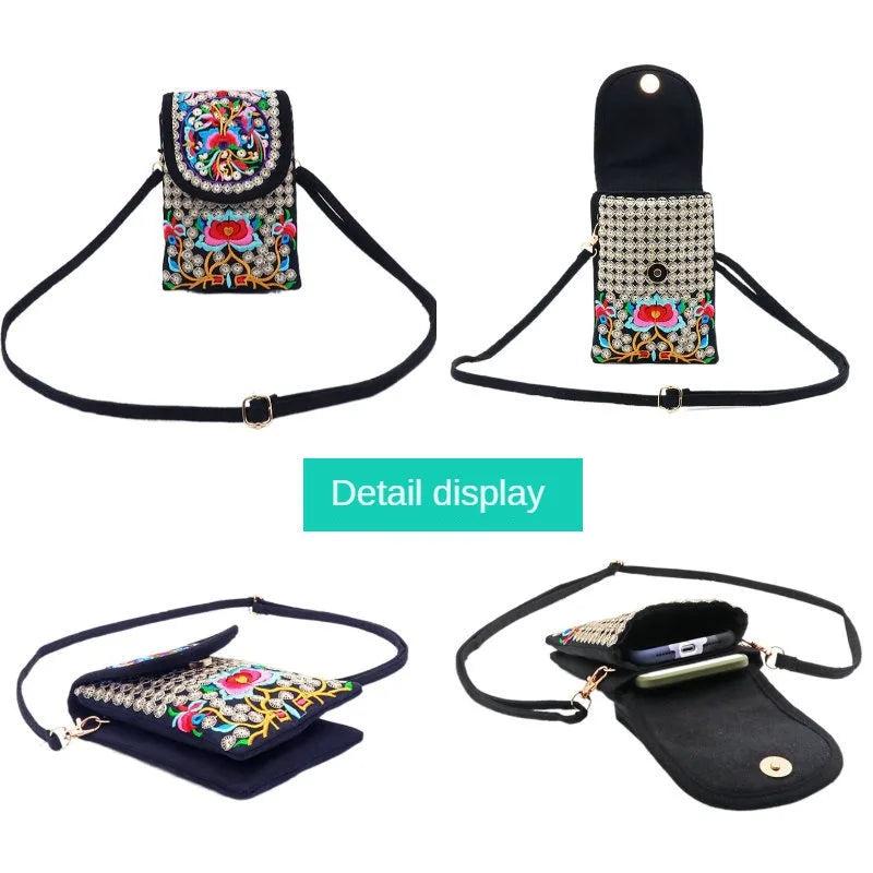 This women's shoulder bag features a flip ethnic style with intricate floral embroidery on canvas. It is a retro handbag that doubles as a messenger bag, small phone purse, and travel pouch.