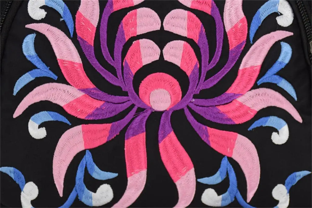 This women's street backpack features a patchwork design with ethnic embroidery, making it a stylish and functional accessory for girls.