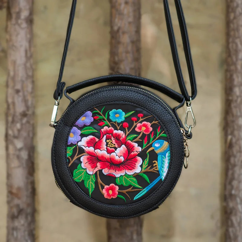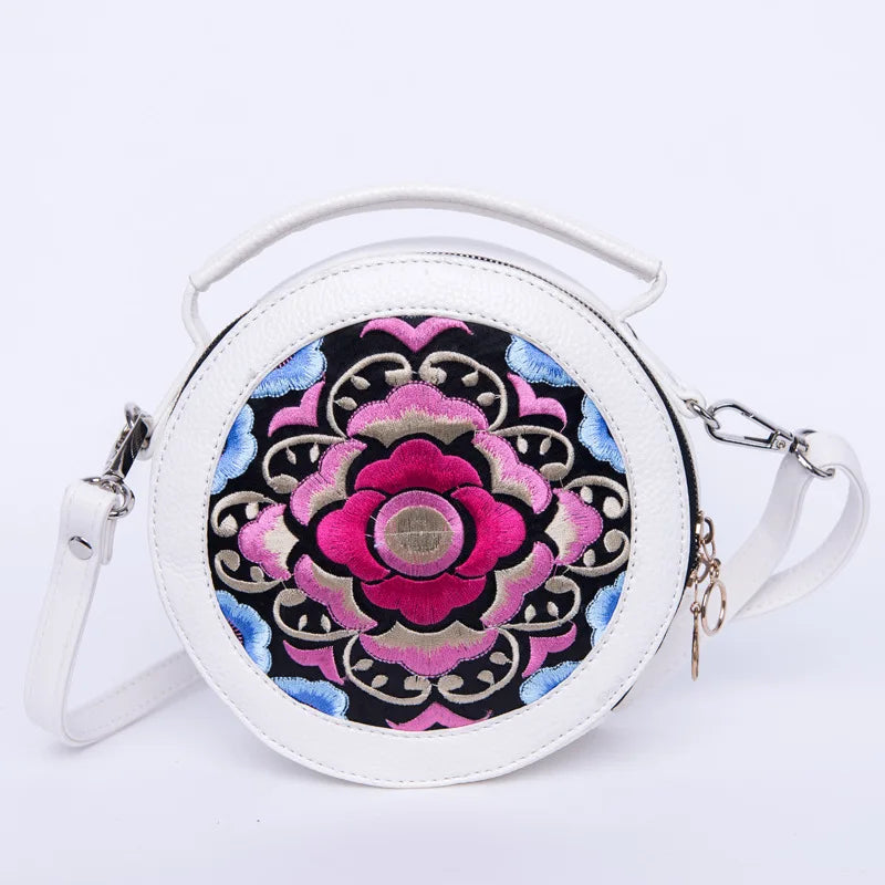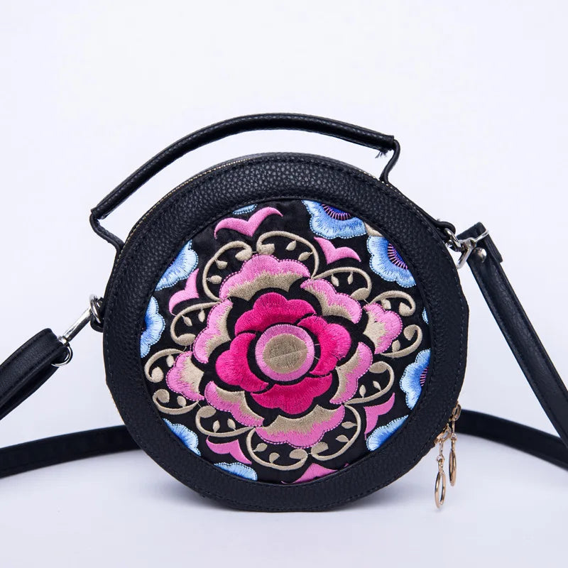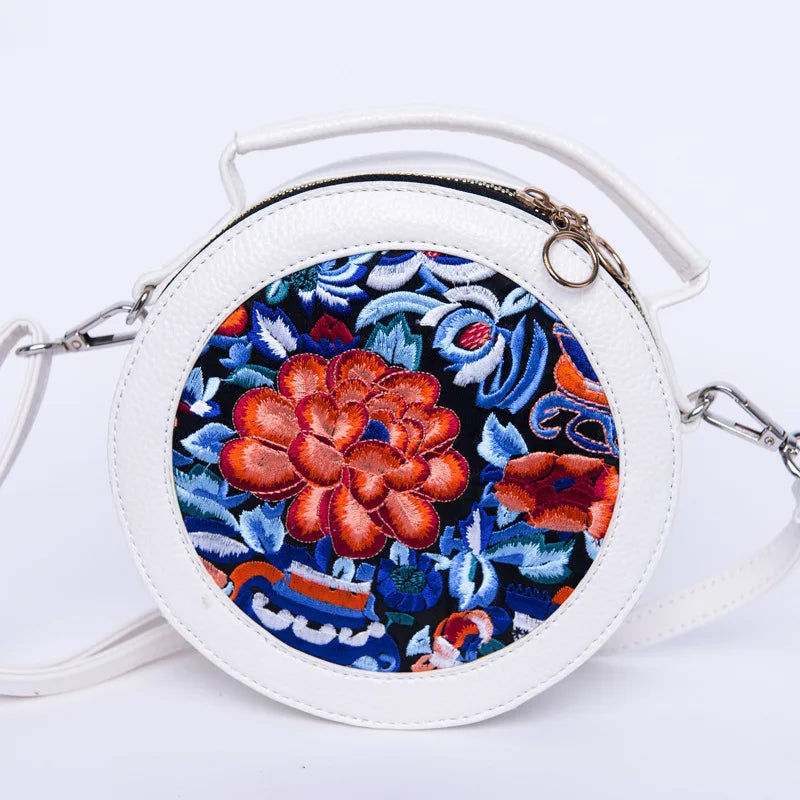 Description:This retro style small bag features ethnic embroidery on PU leather material, suitable for various occasions.Features: Retro design with beautiful embroidery Made of high-quality PU leather material Can be carried by hand, over the shoulder, or diagonally Compact size perfect for everyday use Unique round shape adds a stylish touch...