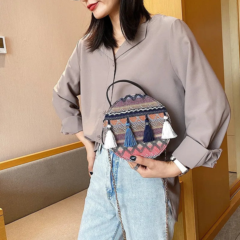 This stylish round handbag is made of high-quality PU leather with tassel decoration, perfect for beach outings, travel, and casual wear.