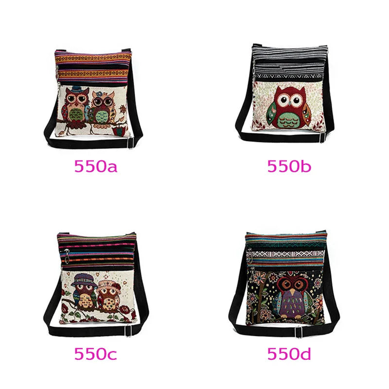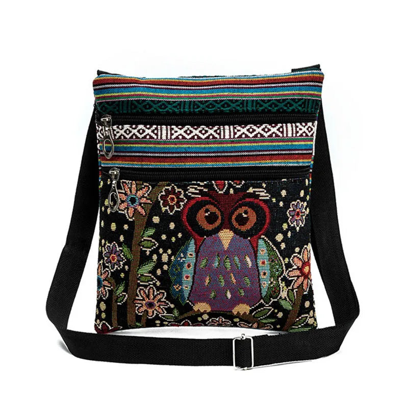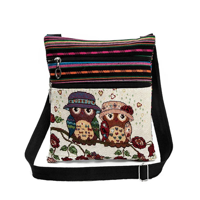 This ethnic style messenger bag features an adorable cartoon owl embroidery, making it a perfect accessory for ladies who love unique designs. The dual zipped compartments offer convenient storage and organization. Ideal for shopping or daily use.