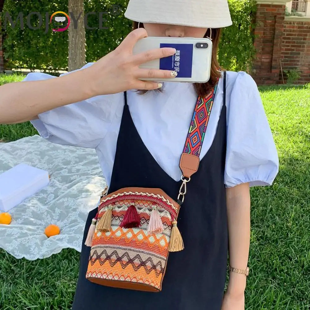 Ethnic Style Women Wide Strap Shoulder Crossbody Bucket Bag