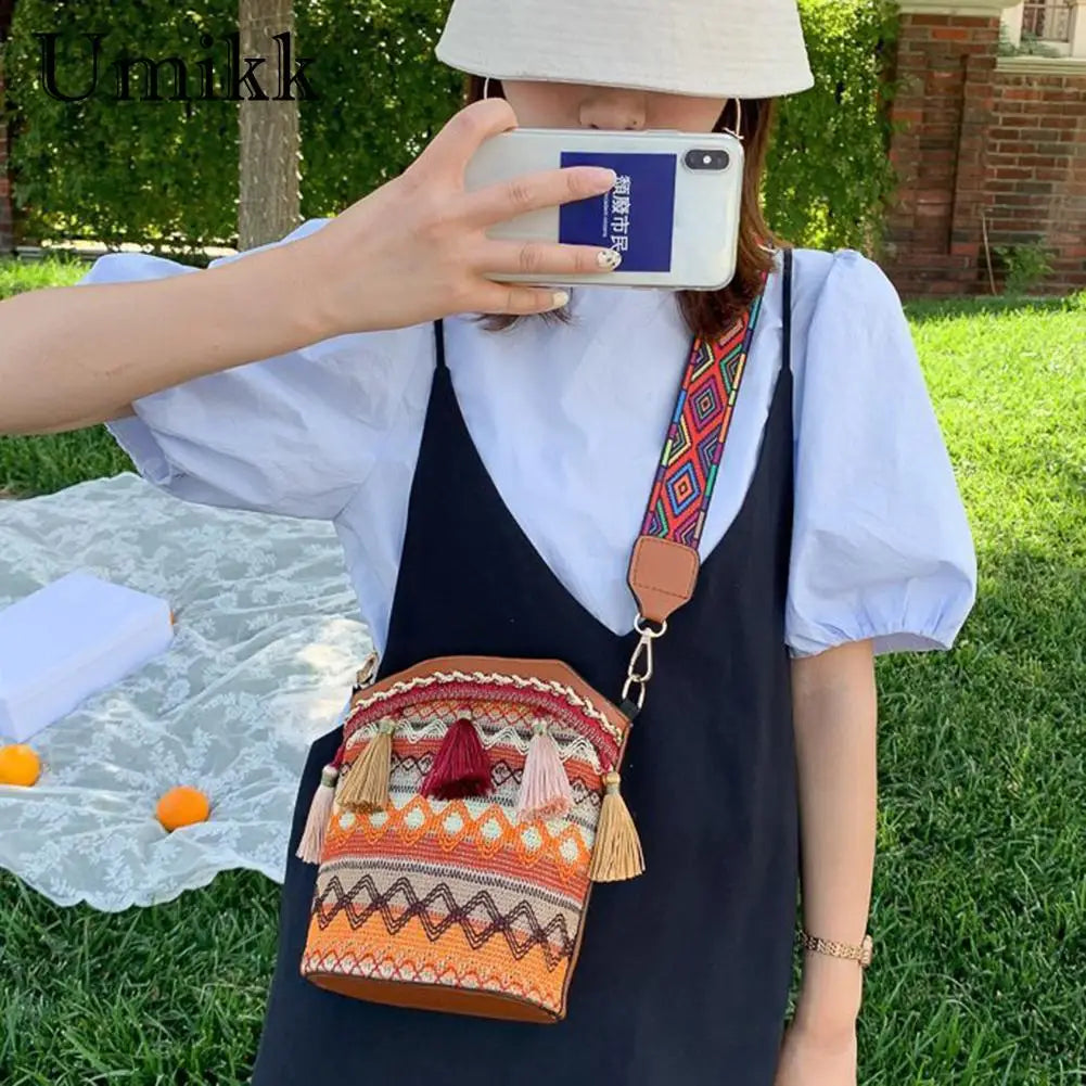 Ethnic Women Shoulder Crossbody Bag Woven Tassels Small Bucket Handbags