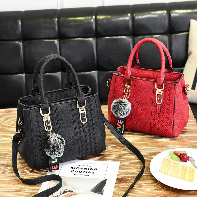 This stylish handbag is perfect for women who love a European and American fashion vibe. It features a cute hair ball pendant and can be worn as a shoulder or crossbody bag.