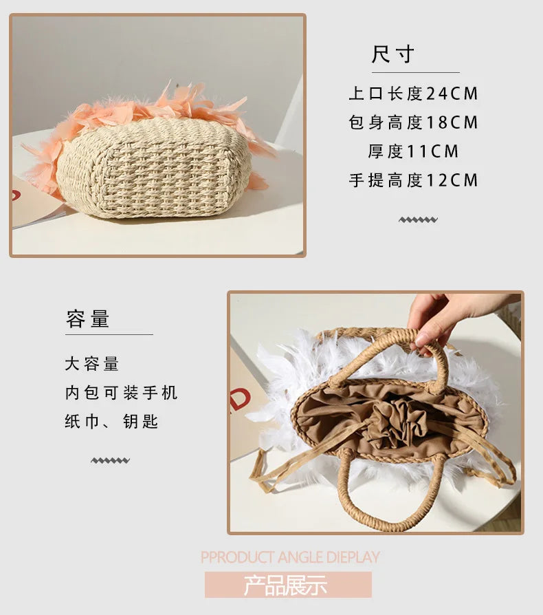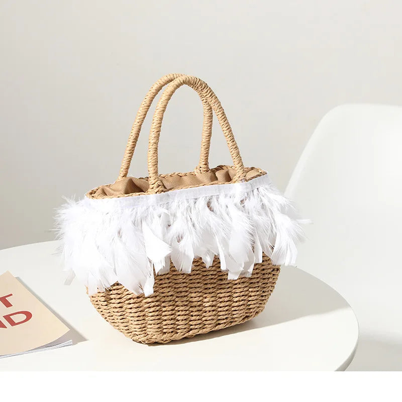 Get into the vacation spirit with this stylish straw bag featuring delicate fairy feather design. Ideal for seaside travel and beach outings.