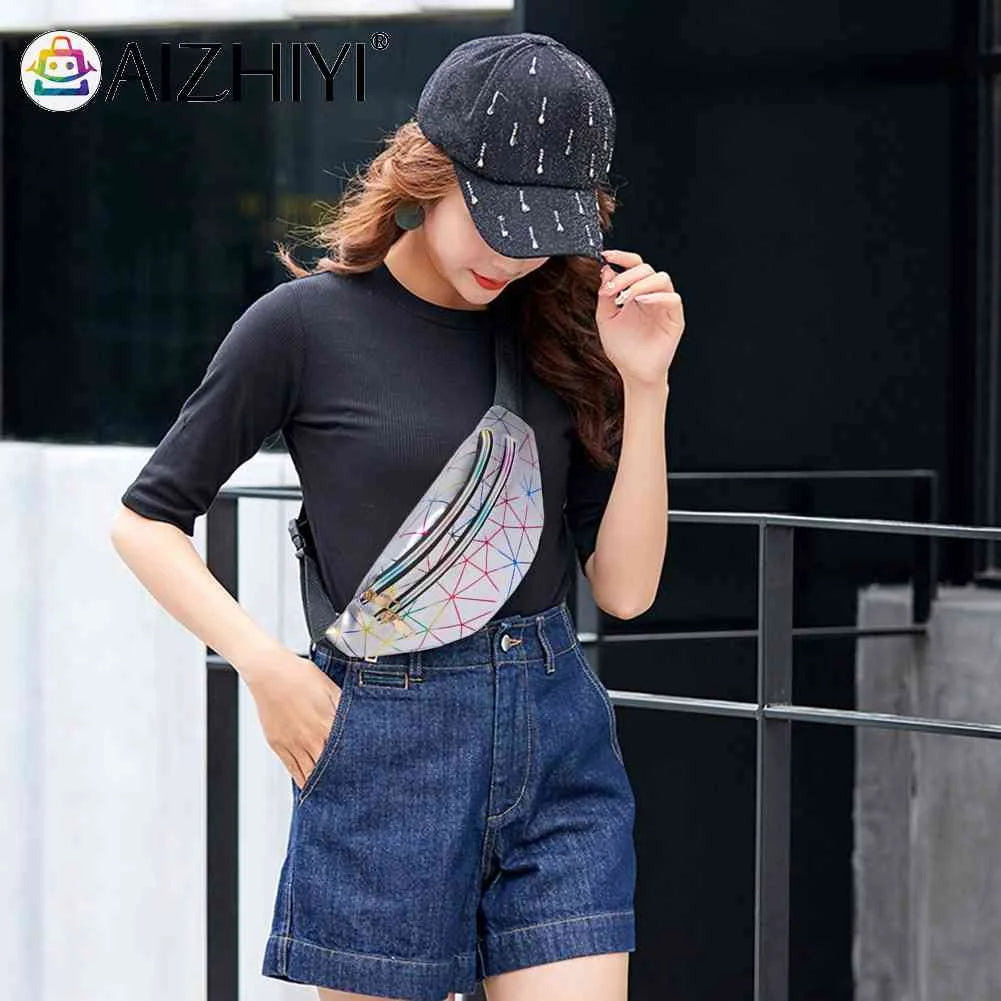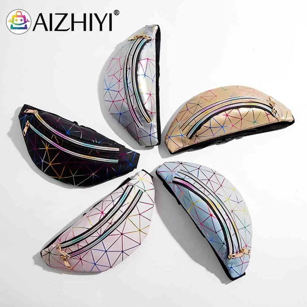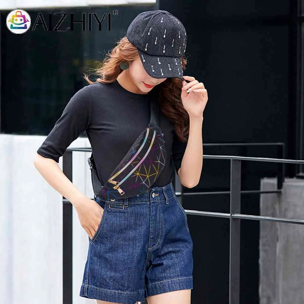 This laser fanny chest pack features a stylish geometric pattern design, made of high-quality PU leather. It can be worn as a waist belt pouch or transformed into a shoulder crossbody bag with its adjustable strap. The bag has a zipper closure for secure storage of your essentials while on the go.