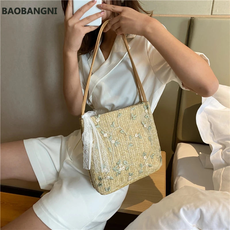 Stay stylish this summer with this elegant straw shoulder bag, a perfect accessory for the beach or casual outings.