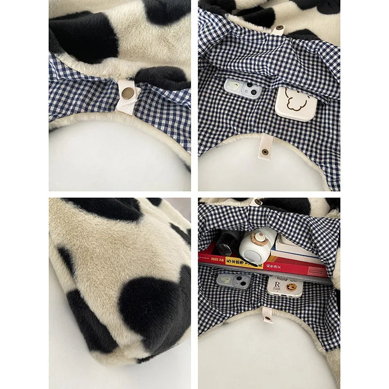 Stay stylish with this faux fur shoulder bag featuring a love heart print design. The soft plush material adds a touch of luxury. It is spacious enough to carry your essentials and is perfect for shopping or as a book bag.