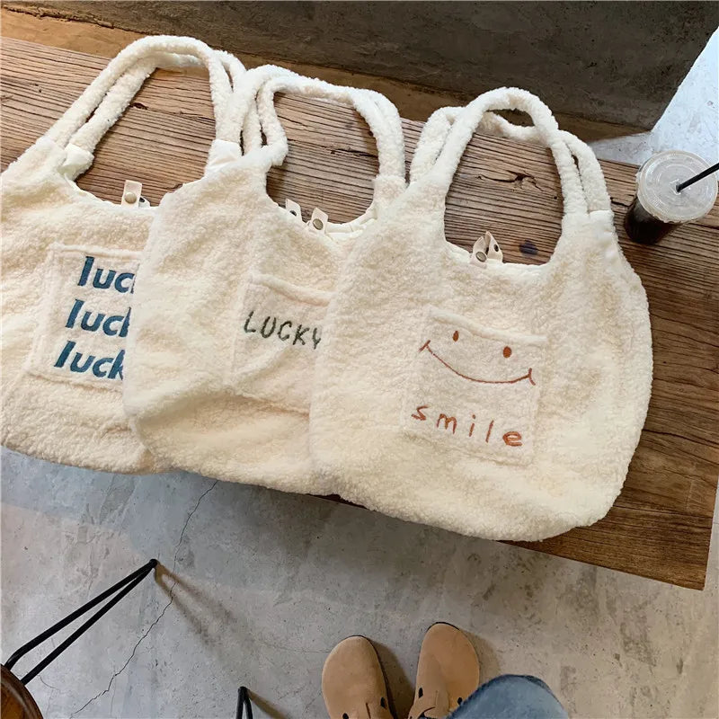 Stay stylish with this faux lamb wool shoulder bag that features an outer pocket, plush design, and letter embroidery. Perfect for carrying your essentials in comfort.