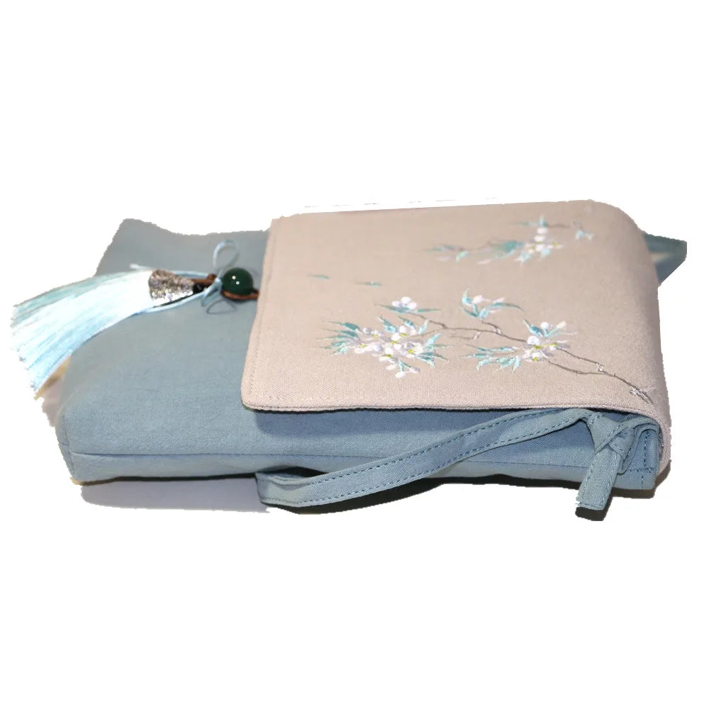 This women's flap messenger bag features a stylish floral embroidery cover made of cotton fabric. It's a convenient crossbody bag for holding your essentials.