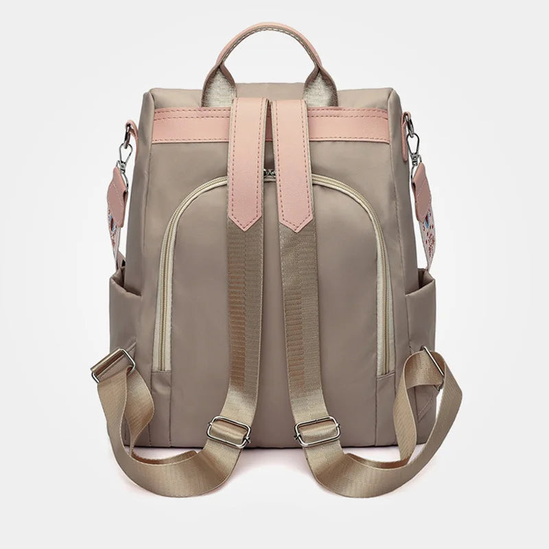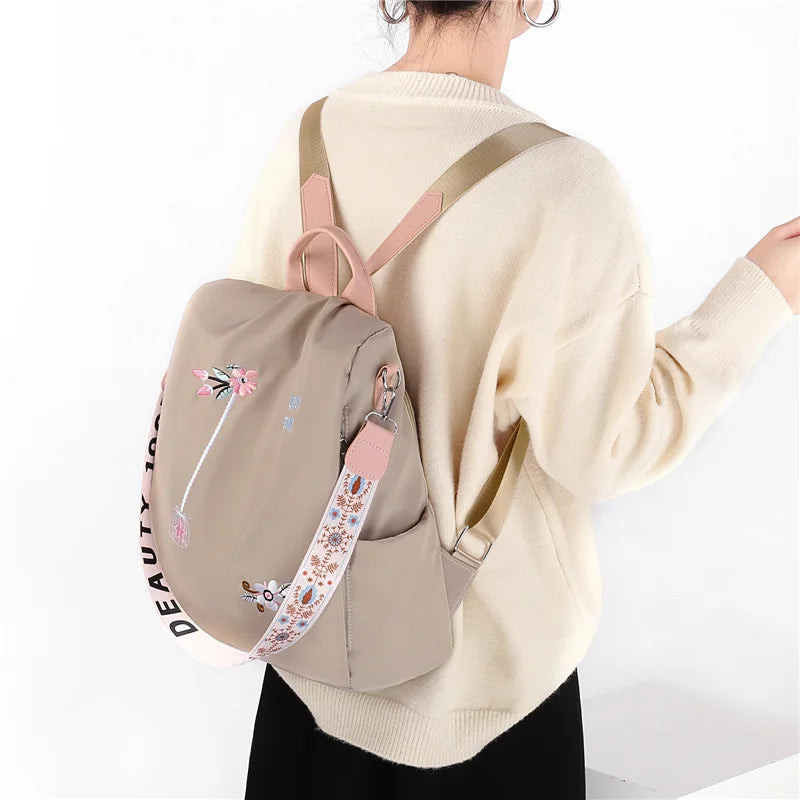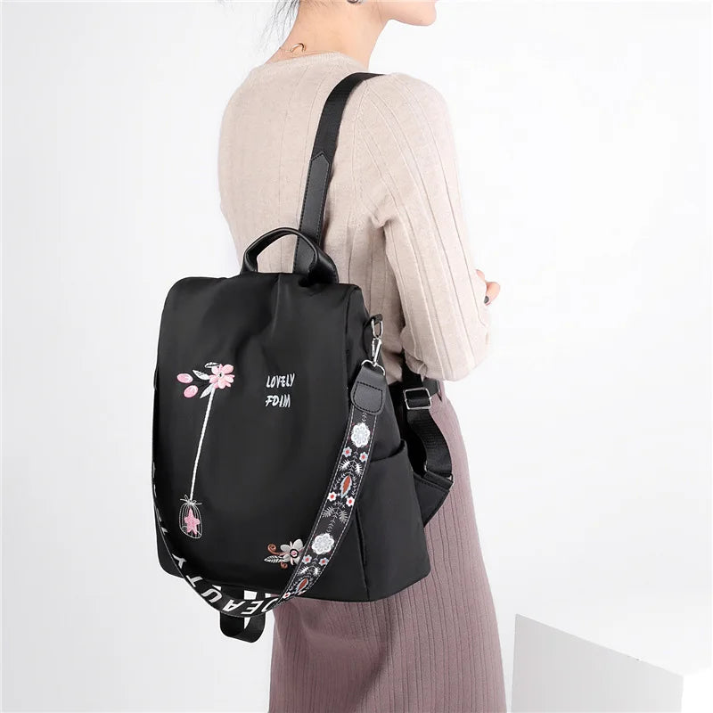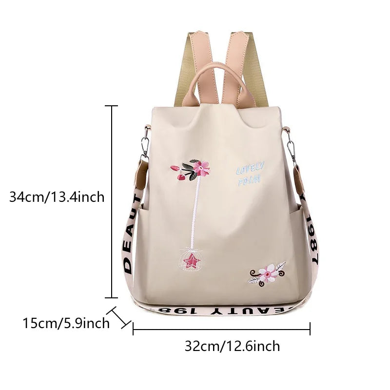 This backpack is designed for style and functionality, made of waterproof Oxford material. It features beautiful flower embroidery, large capacity, anti-theft design, and comfortable shoulder straps.