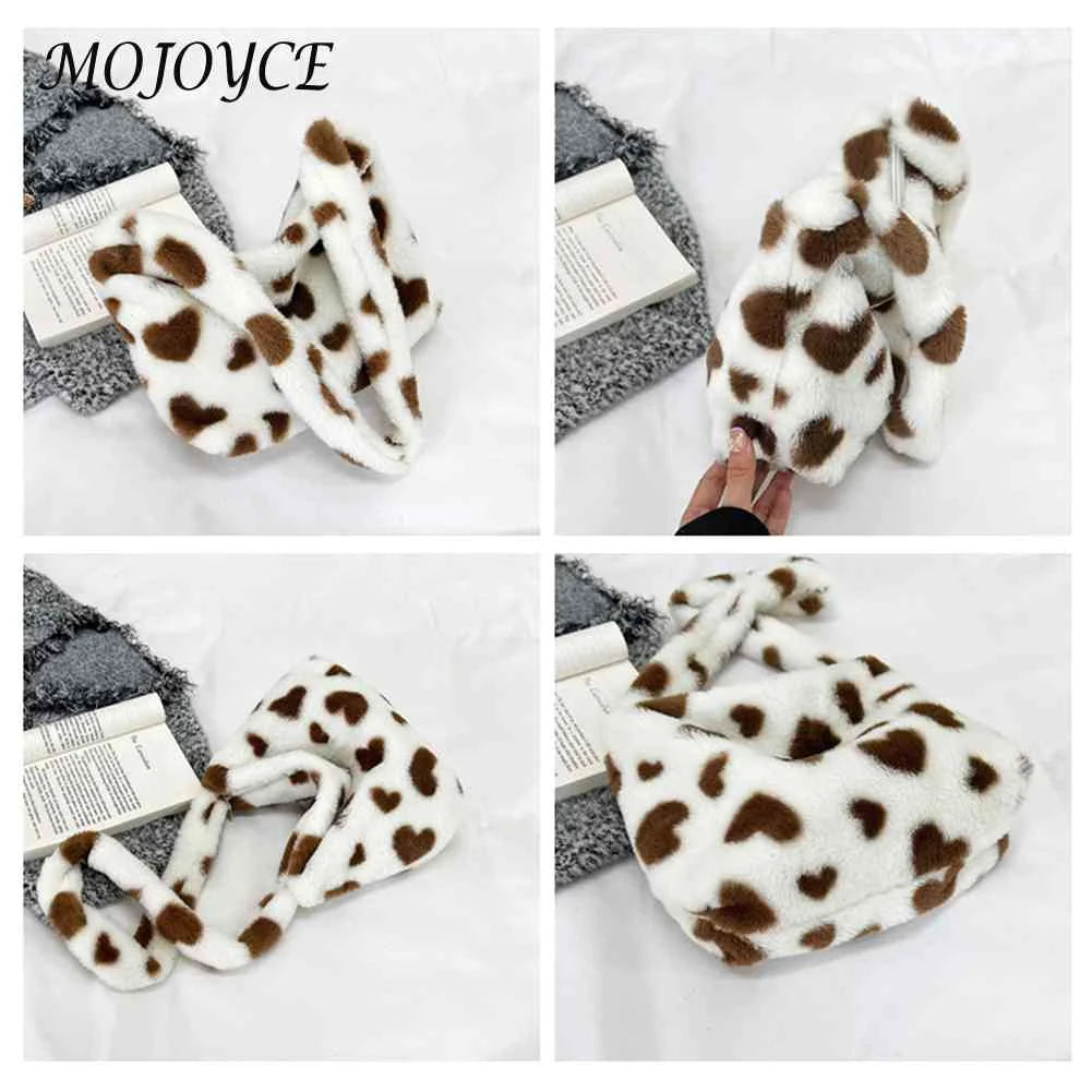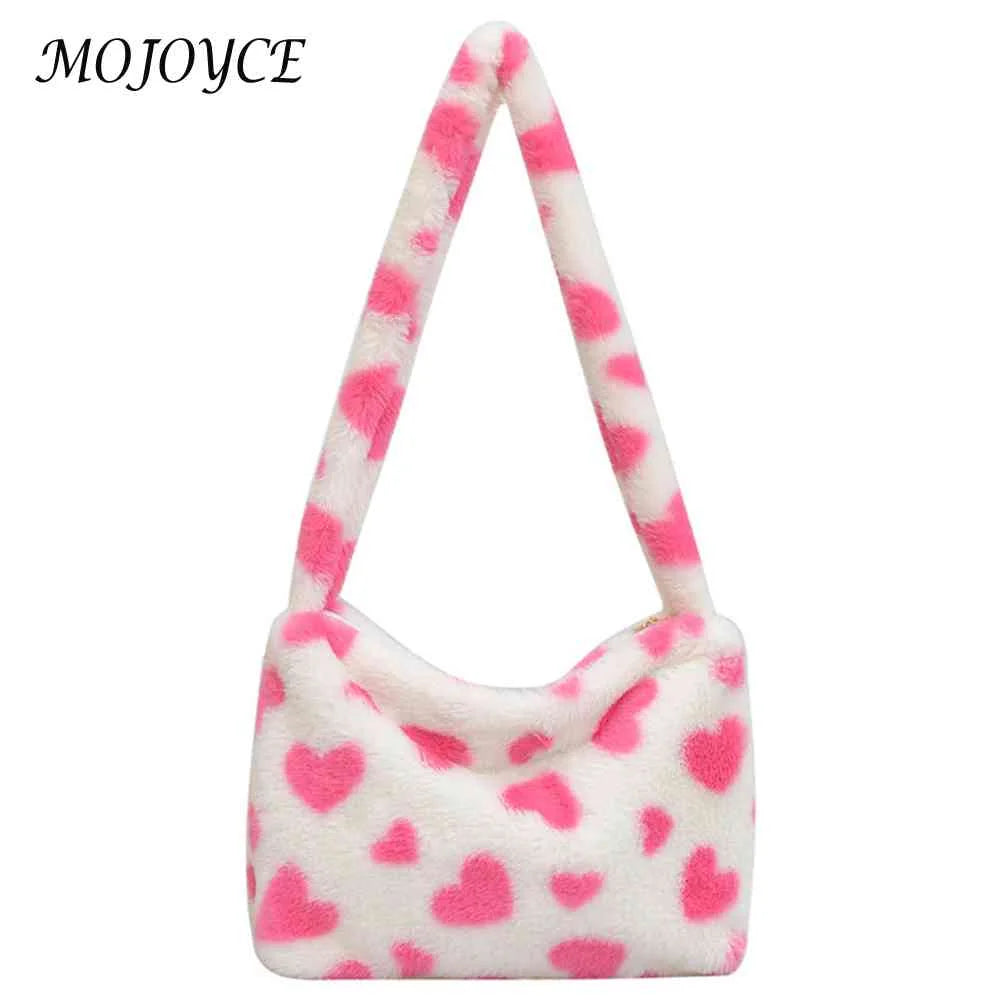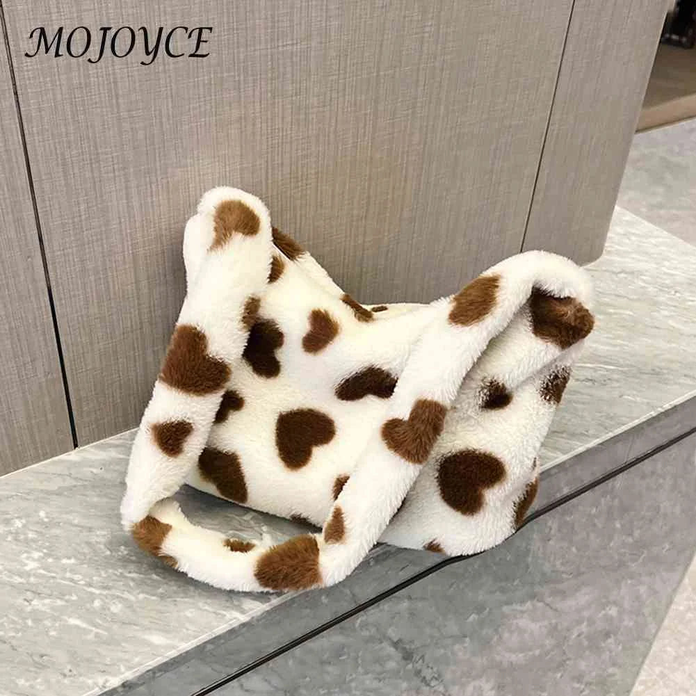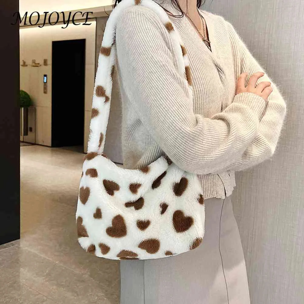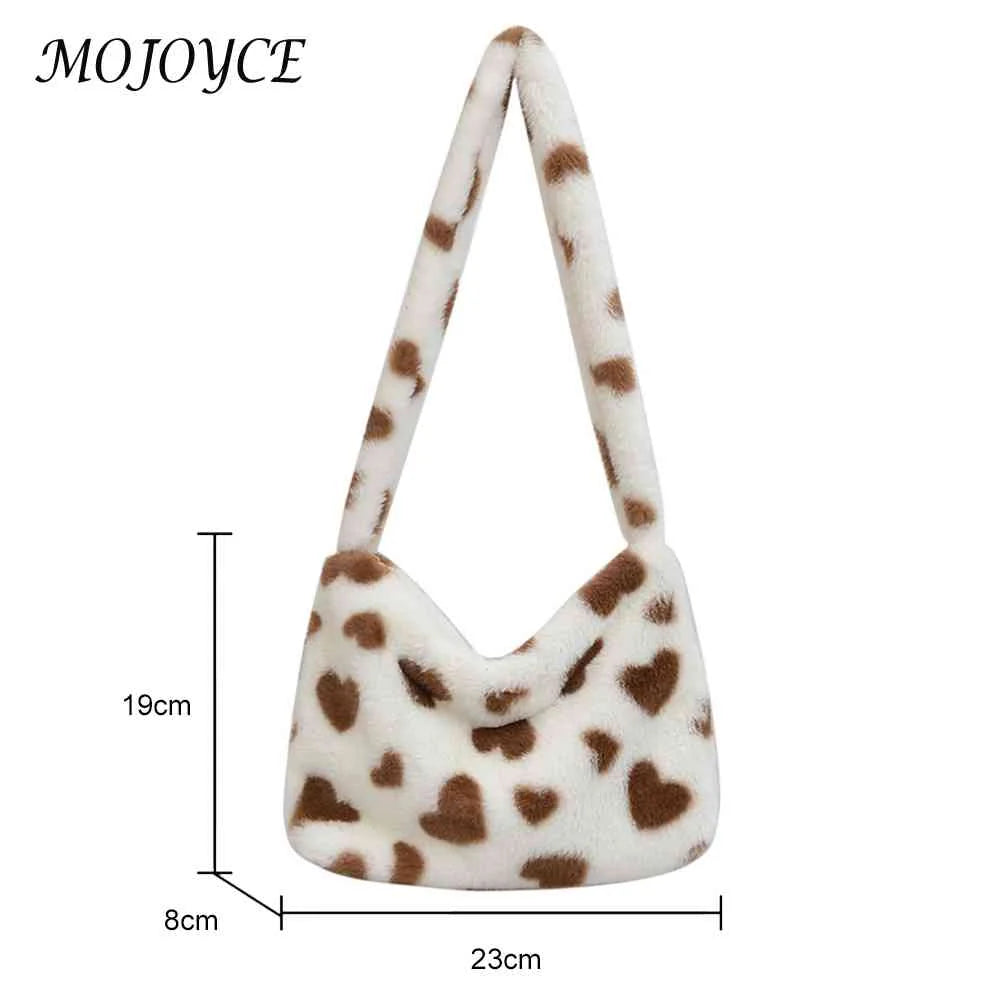 Stay stylish and cozy with this plush commute bag featuring a cute love heart print, perfect for autumn and winter outings. Ideal for holiday parties and casual use.