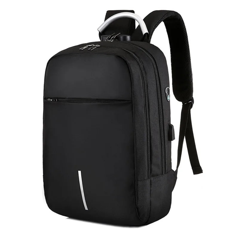 Stay secure and organized with this anti-theft backpack featuring a combination lock. The backpack has a large capacity for a 15.6-inch laptop and includes a USB charging port for convenience during business travel.
