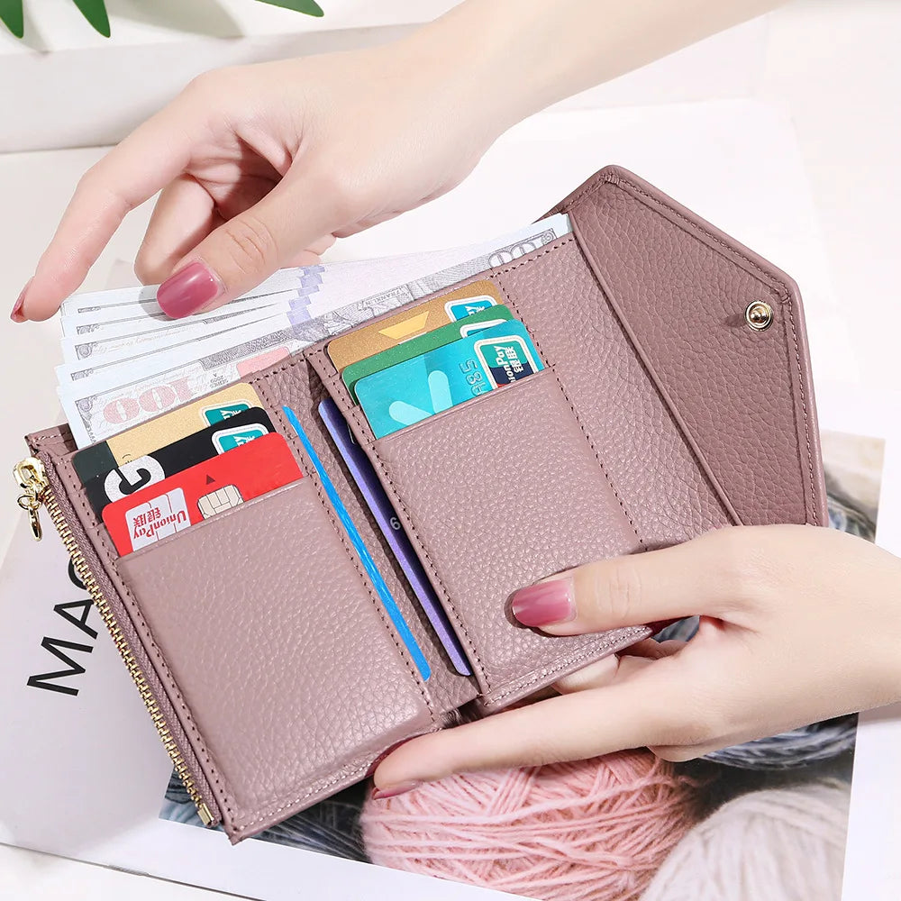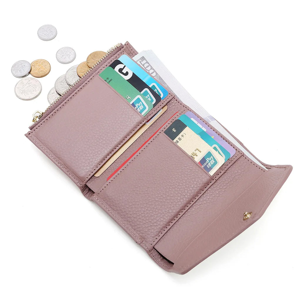 High quality first layer leather women's folded wallet with card slots and coin pocket.