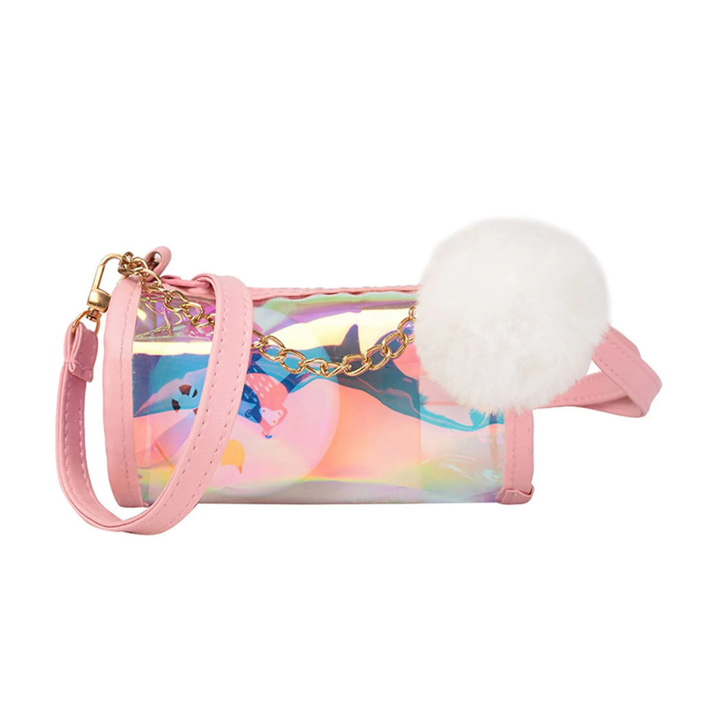 Adorable holographic laser crossbody bag for kids featuring a clear design with a cute pompom detail. Perfect accessory for little fashionistas!