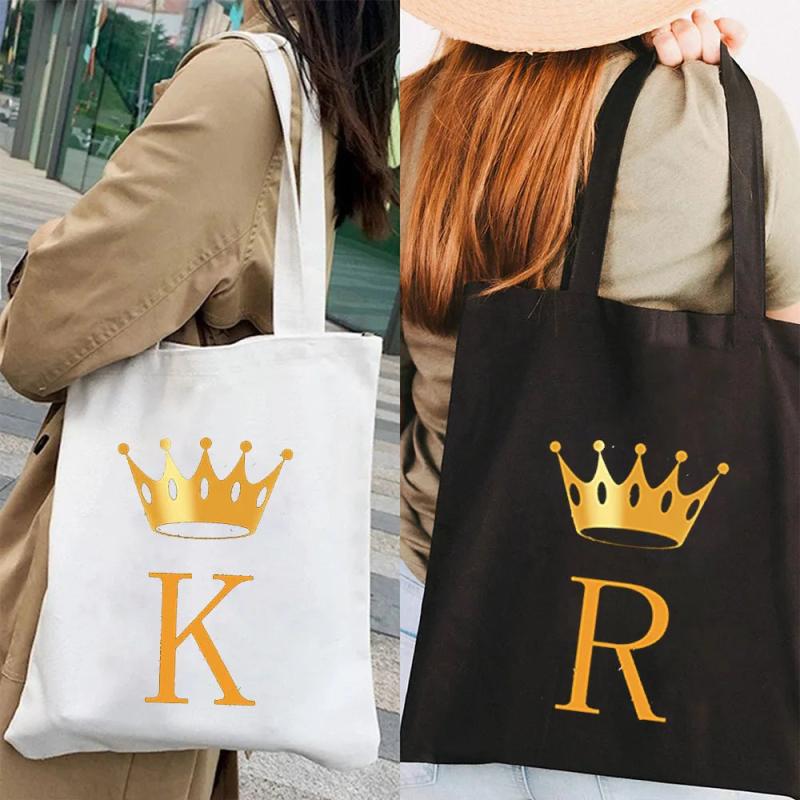 This stylish shopper bag features a golden alphabet design, perfect for women. Made of durable canvas, it's ideal for everyday use.