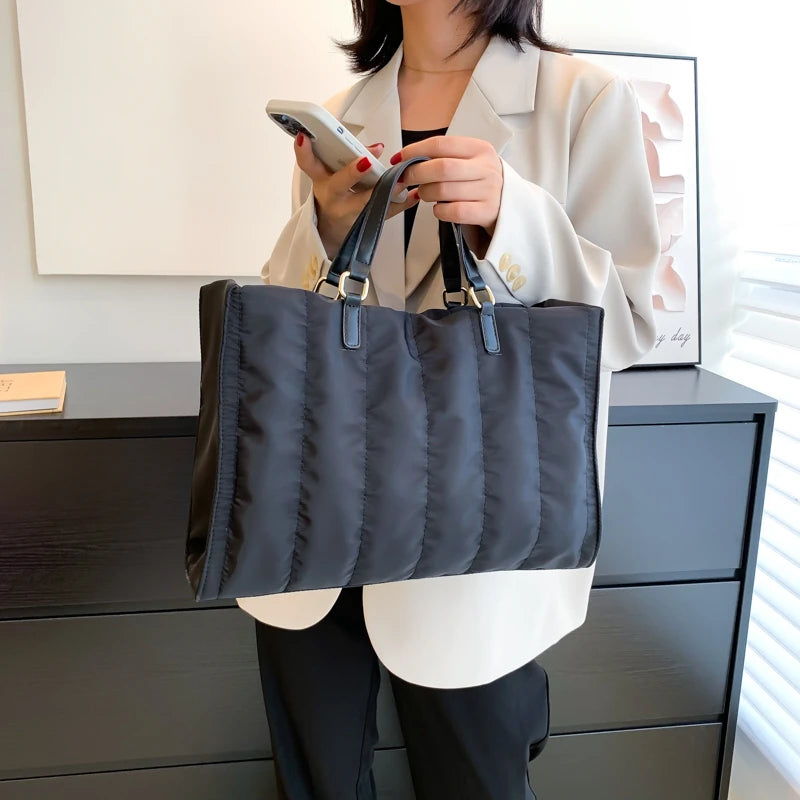 Stay stylish and cozy with this large shoulder bag in green and beige. Made from down cotton and nylon, this padded handbag is perfect for winter. Versatile as a tote or crossbody bag, it's a must-have accessory for any lady.