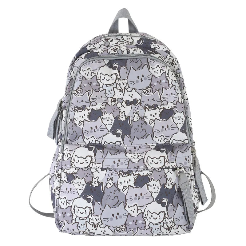 This grey backpack features a female cartoon print, perfect for school, travel, and college. It has ample space for a laptop and other essentials.