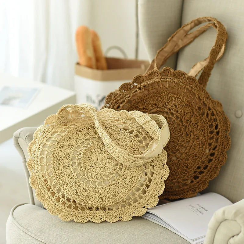 Hand-Woven Straw Bag Women Circle Shape Rattan Bag Big Capacity
