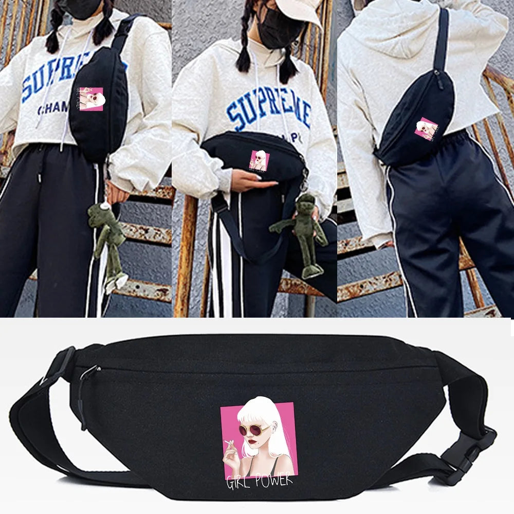 Stay trendy with this Harajuku style waist bag featuring a girl print. Perfect for hip-hop and street fashion enthusiasts. Can be used as a chest pack or crossbody bag.
