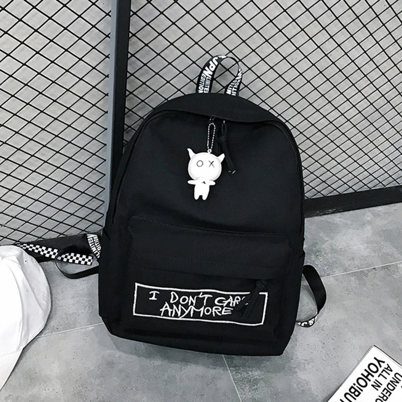 This trendy canvas backpack features a cute doll pendant and is perfect for high school girls. Its Harajuku style design is both fashionable and functional.