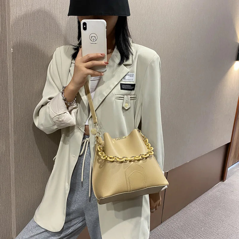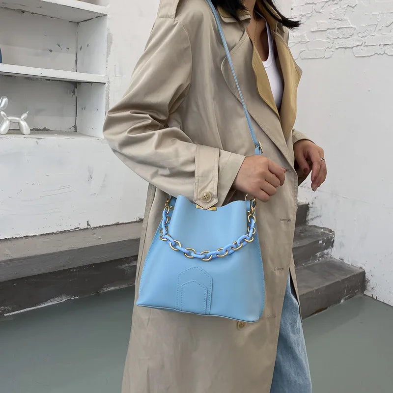 This female chain tote bag is crafted from high-quality PU leather, making it perfect for travel and everyday use. It features a spacious interior and a stylish design.