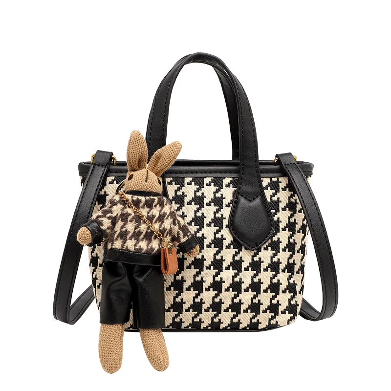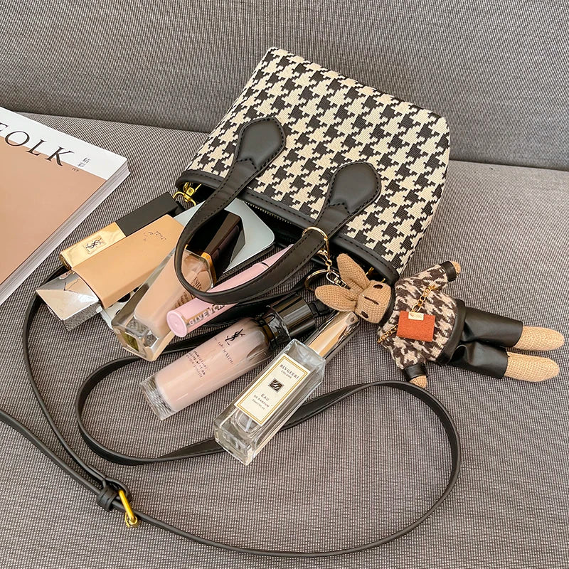 Description:Elevate your style with this houndstooth handbag featuring a spacious design and high-end look. Perfect for carrying all your essentials with ease.Features: Large capacity handbag with houndstooth design High-end and stylish diagonal bucket bag Comes with a bear ornament for a playful touch Ideal for carrying essentials in a fashionable...